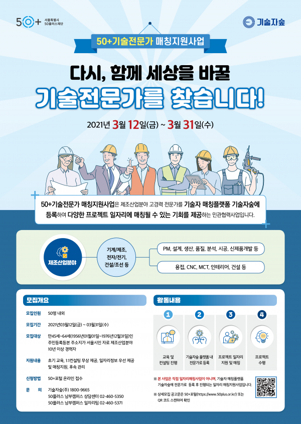 ‘50+기술전문가 매칭지원사업’은 제조산업 근무 10년 이상의 경력을 가진 만 45세~67세 서울시 거주자를 대상으로 한다.