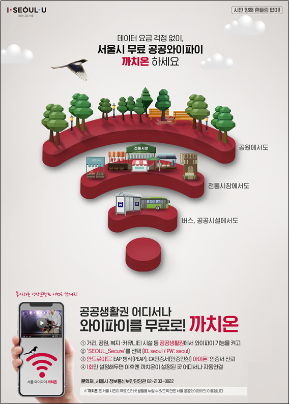 서울시는 정보소외계층이 많이 이용하는 복지시설 등 실내공간에 무료 공공와이파이 까치온을 구축함으로써 가계통신비 부담을 덜고 지역간·계층간 통신격차를 해소해나갈 것으로 기대하고 있다.