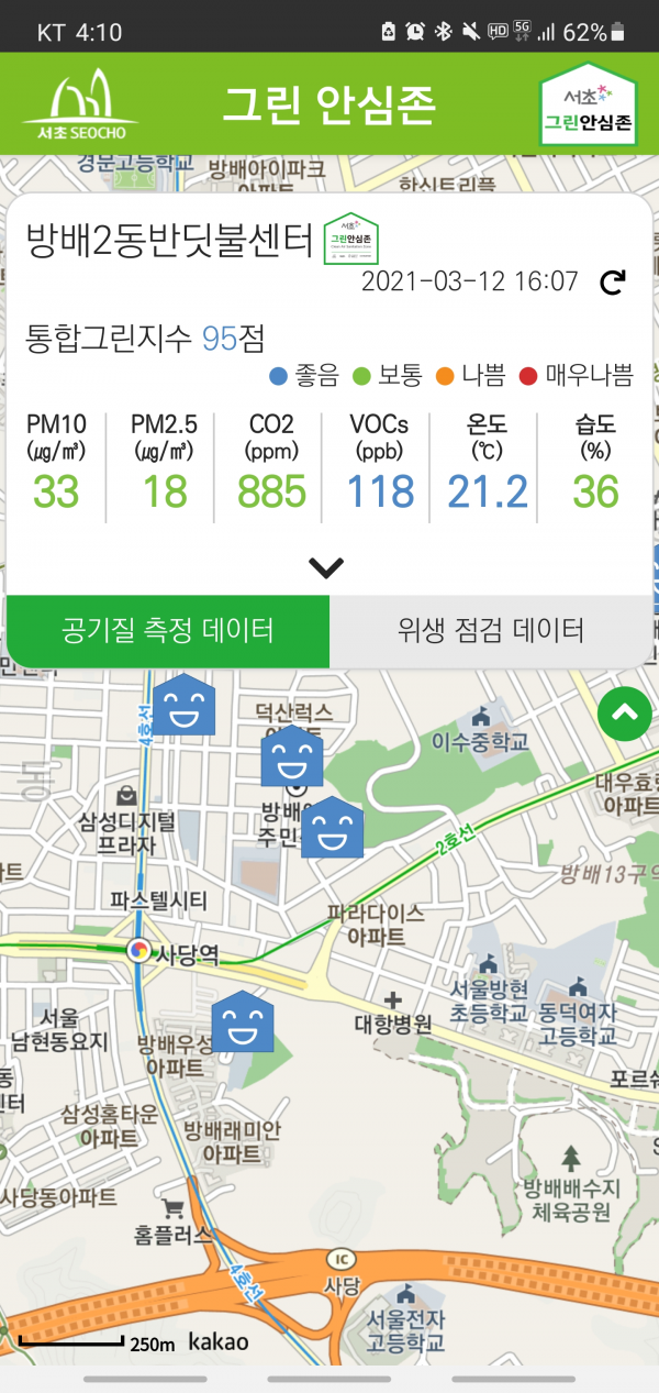 이렇게 3개월 이상 상시 모니터링 한 실내 공기질 빅데이터를 바탕으로 실내 공기질을 우수하게 관리하고 있는 시설에 ‘서초 그린 안심존’ 인증마크까지 부여해서 지속적으로 꼼꼼하게 운영하는 것이 이 프로젝트의 핵심이다.