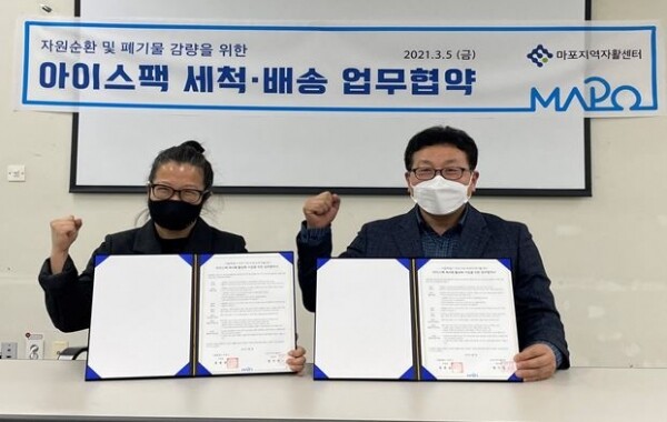 자원순환 및 폐기물 감량을 위해 구가 추진하는 ‘아이스팩 재활용사업’의 참여업체로 마포지역자활센터가 선정되며 지난 5일 구와 마포지역자활센터는 세척·배송 업무협약을 체결한 바 있다.