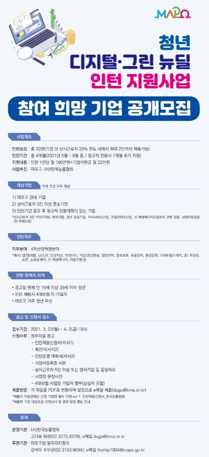 유동균 마포구청장은 “포스트코로나 시대를 대비하기 위한 인공지능, 빅데이터, 로봇공학, 신재생에너지 등 4차산업 혁명분야의 우수 중소기업을 발굴하고 청년에게는 4차산업 직무역량을 강화시킬 수 있는 기회를 제공하고자 한다“라며 ”이번 ‘청년 디지털·그린 뉴딜 인턴 지원사업’에 많은 지역 내 기업들의 관심과 신청을 바란다”고 말했다.