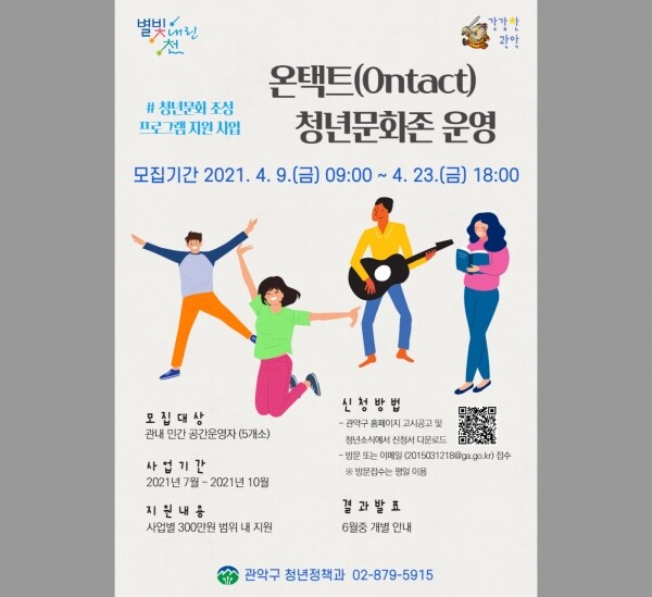 신청대상은 관악구에 소재를 둔 등록단체로 33㎡ 이상의 공간을 보유하고 청년 대상 온택트 생활강좌, 공연, 행사 등 정기적인 프로그램 운영이 가능한 사업자이다.