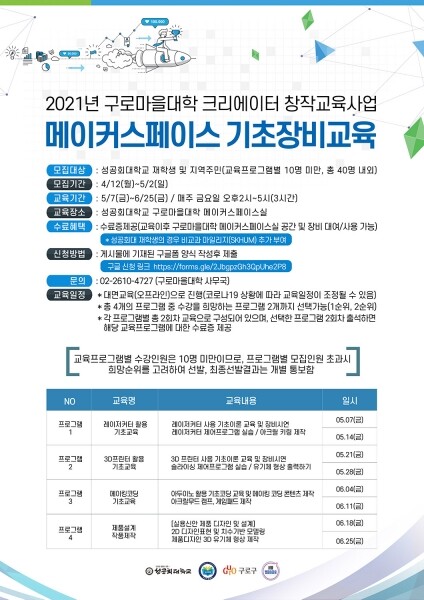 프로그램은 다음달 7일부터 6월 25일까지 매주 금요일 성공회대학교 구로마을대학 메이커스페이스실에서 순차적으로 실시된다.