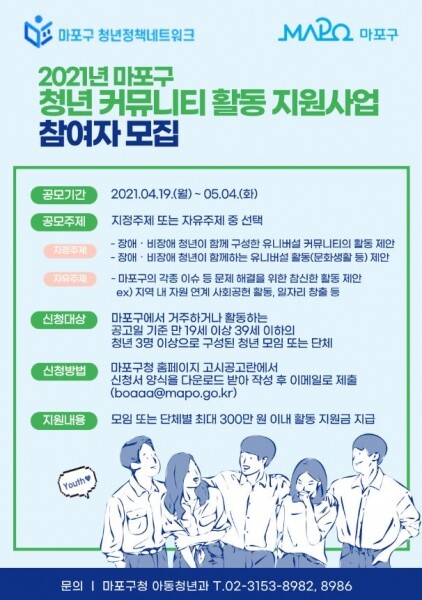 신청 기간은 오는 5월 4일까지이며 참여를 원하는 청년 모임 및 단체는 마포구청 홈페이지 고시공고 란에서 신청서를 내려 받아 작성한 뒤 관련 구비 서류와 함께 전자우편으로 제출하면 된다.
