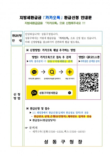 이에 스마트폰을 사용 간단하고 편리하게 환급금을 받을 수 있도록 카카오톡채널을 개설, “성동구지방세환급”의 채널을 통해 환급대상자의 환급금을 손쉽게 조회하고 돌려받을 수 있게 했다.