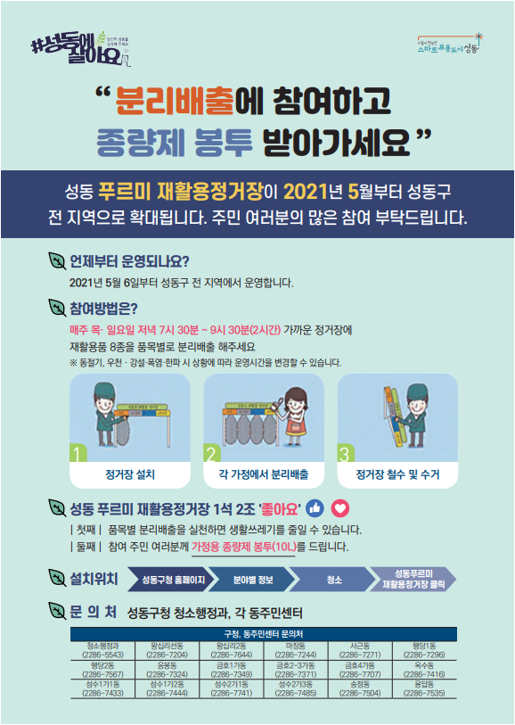 ‘성동 푸르미 재활용 정거장’ 은 주택가 혼합배출 쓰레기를 줄이고 쾌적한 환경을 조성하고자 거점장소에 분리수거함을 설치하고 자원관리사를 배치해 주민들의 분리배출을 돕는 사업으로 매주 목요일과 일요일 저녁 7시 30분부터 9시 30분까지 운영된다.