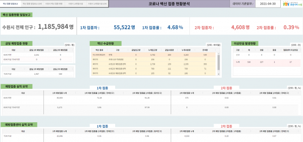 수원시 관계자는 “코로나 백신 접종에 대한 데이터가 투명하게 공개되는 만큼 시민들이 관련 정보를 확인해 우리 지역의 접종 진행 상황을 파악하고 안심하는 데 도움이 될 것”이라고 말했다.