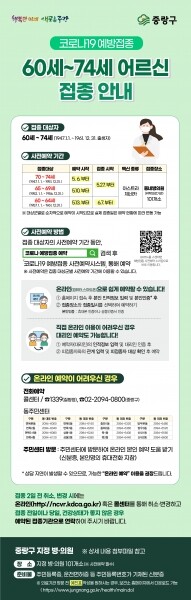 예방접종 시작일은 65~74세 어르신은 5월 27일부터, 60~64세 어르신은 6월 7일부터이다.