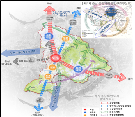 특히 북부생활권의 종축장부지 개발사업 등 첨단산업단지와 인접한 충남-경기 상생협력권, 경기남부의 해상물류·산업단지와 연계한 복합산업벨트 구축 방안을 담았으며 당진~천안 고속도로 세종~포천 고속도로 등 광역적 도로 연계 및 서해안 벨트를 고려한 동서횡단철도 노선을 구축해 중부권 물류의 거점 도시 육성에 이바지하는 상생발전 방안 등도 확정했다.