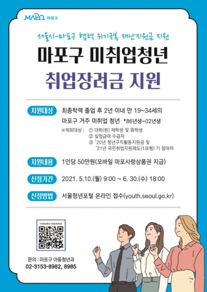 지원 대상은 공고일인 5월 10일 이전부터 마포구에 주민등록상 주소를 둔 만 19세에서 34세 청년으로 최종학력 졸업 후 2년 이내인 미취업자다.
