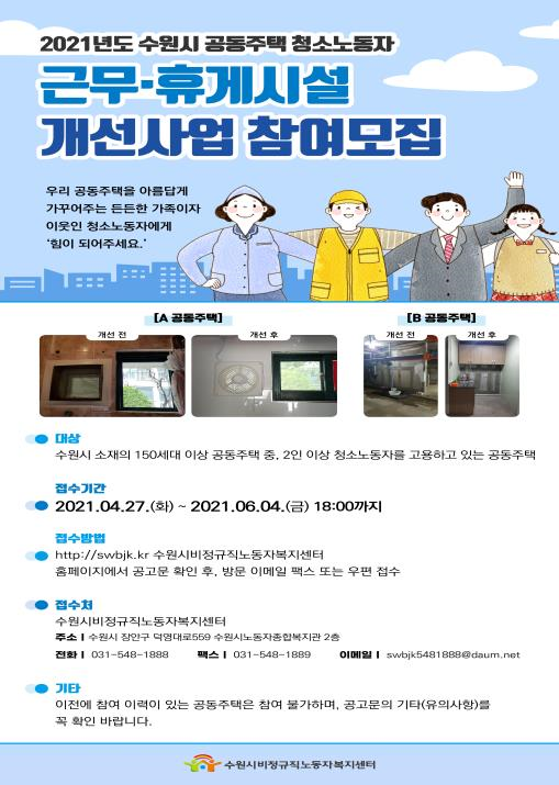 수원시비정규직노동자복지센터가 주관하는 휴게시설 개선사업은 공동주택 청소원·중소기업 노동자의 열악한 휴식 공간을 수리할 수 있도록 사업비를 지원하는 것이다.