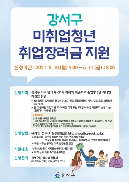 지원대상은 강서구 거주 만 19세 이상 34세 이하 청년 중 최종학력 후 2년이 지나지 않은 미취업자다.