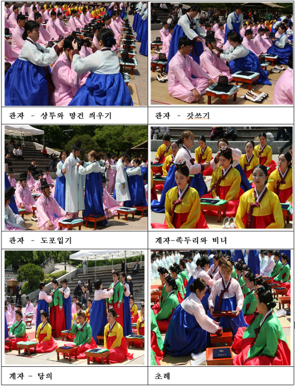 ‘관례’란 땋아 내렸던 머리를 올려 상투를 틀고 관을 씌운다는 의미로 어른이 되는 남자를 상징하고 여자는 머리를 올려 쪽을 찌고 비녀를 꽂는다는 뜻으로 ‘계례’라 했다.