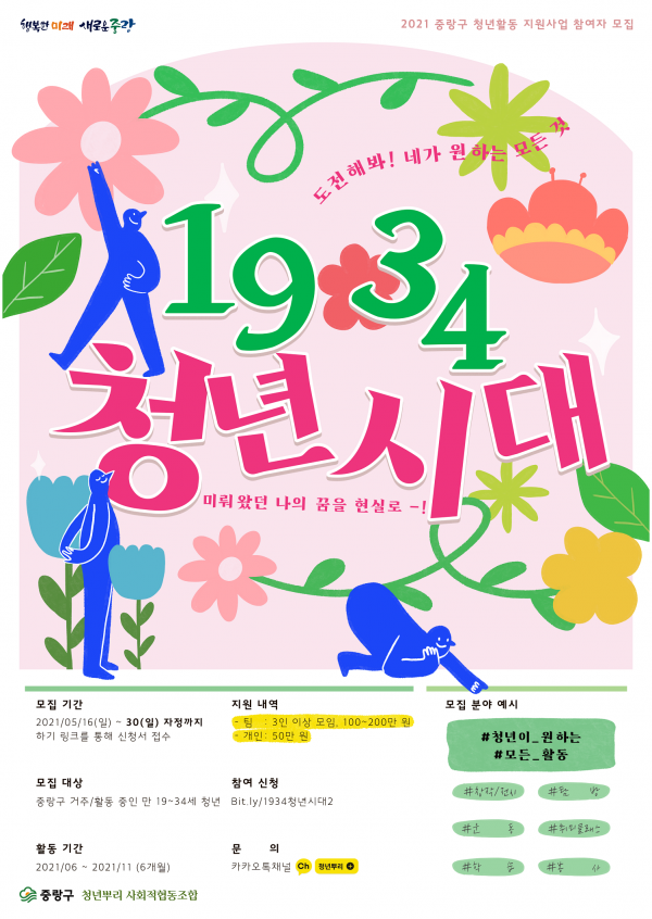 중랑구가 지역 청년들이 일상에서의 소소한 도전을 직접 달성하고 폭넓은 경험을 할 수 있도록 하는 청년활동 지원사업인 ‘1934 청년시대’ 참여자를 모집한다.