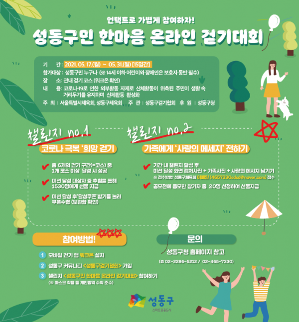 대회는 ‘코로나 극복 희망 걷기’와 ‘가족에게 사랑 메시지 전하기’의 내용으로 진행, 성동구민 누구나 참여 가능하다.