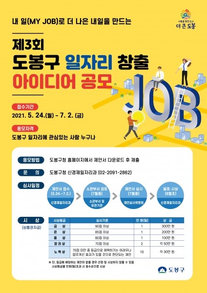 공모기간은 2021년 5월 24일부터 7월 2일까지이며 도봉구 일자리 창출을 위한 아이디어를 가진 누구나 참여할 수 있다.