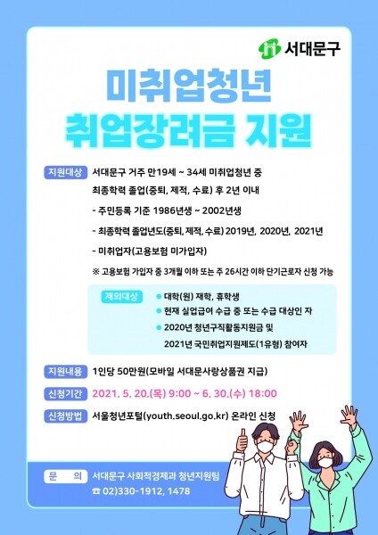 문석진 서대문구청장은 “이번 취업장려금이 코로나19 장기화로 취업에 어려움을 겪고 있는 청년들에게 조금이나마 도움이 되길 바란다”고 말했다.