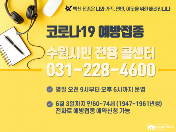 연령·대상별 예약신청 기간에 인터넷 예약신청이 어려운 수원시민은 동행정복지센터에 방문하지 않고 예방접종 콜센터를 통해 신청할 수 있다.