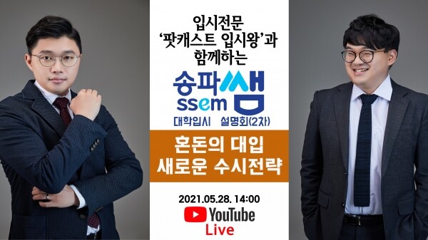 이번 2차 설명회는 5월 28일 오후 2시에 국내 최초 입시전문 팟캐스트 ‘입시왕’ 진행자인 최승해 소장과 강성한 소장이 ‘혼돈의 대입, 새로운 수시전략’을 주제로 진행한다.