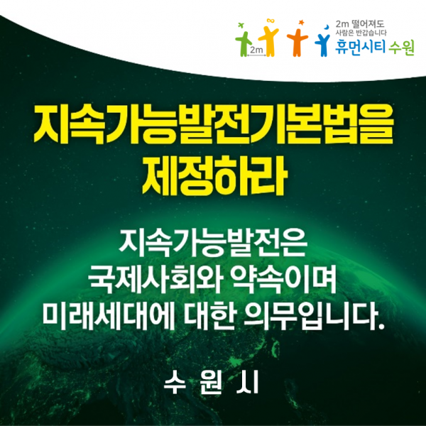 염태영 시장은 26일 개인 SNS에 글을 게시하고 “수원시는 ‘지속가능발전 지방정부협의회’의 일원으로서 현세대와 미래세대 모두의 행복을 지켜가기 위한 ‘지속가능발전기본법’ 제정을 촉구한다”고 말했다.
