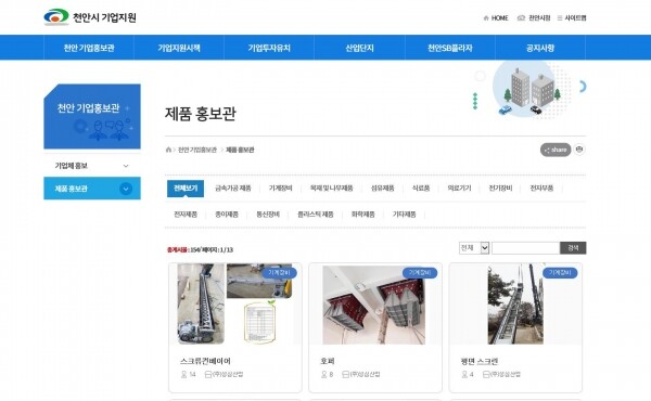 온라인 제품 홍보관은 각 제품에 대한 홍보는 물론 관내 중소기업제품 우선구매 촉진을 위해 제작했으며 천안시 기업지원 누리집 내에 기업홍보, 기업지원시책, 각종 공지사항 등과 함께 게시하고 있다.