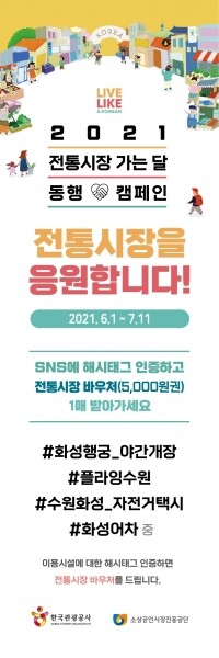 수원시는 수원 화성행궁 야간개장·자전거 택시·플라잉 수원·수원 화성어차를 이용한 후 본인 SNS에 관광시설을 해시태그하고 인증한 관광객에게 전통시장 상품권을 주는 ‘2021 전통시장 가는 달’ 이벤트를 7월 11일까지 연다.