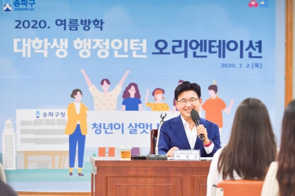 박성수 송파구청장은 “행정인턴 경험이 앞으로 대학생들이 사회생활을 하는데 좋은 자양분이 될 뿐 아니라 송파에 더욱 관심을 가질 수 있는 계기가 될 것”이라며 “코로나19로 인해 취업난을 겪는 대학생들을 위해 다양한 체험 기회를 제공하겠다”고 전했다.
