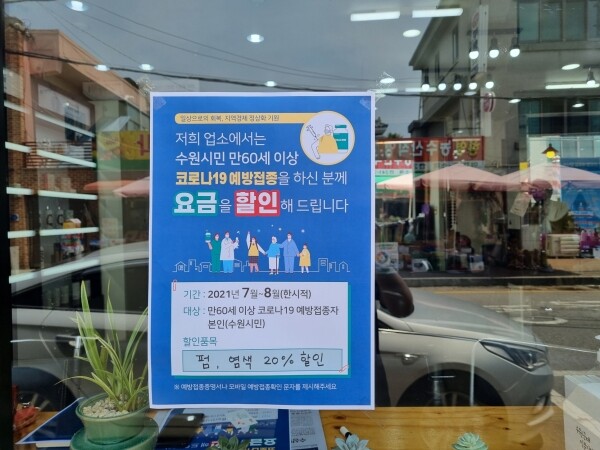 참여 업소는 입구에 ‘수원시민 만 60세 이상 코로나19 예방접종을 하신 분께 요금을 할인해드린다’는 문구가 적힌 안내문을 게시한다.