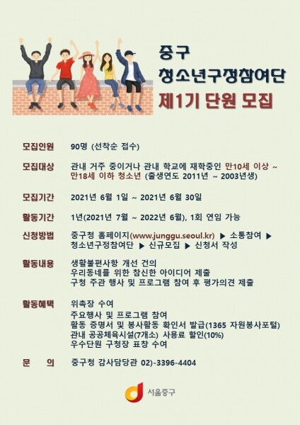 6월 1일부터 30일까지 한 달간 모집하며 중구청 홈페이지 소통참여 게시판에서 신청 가능하다.