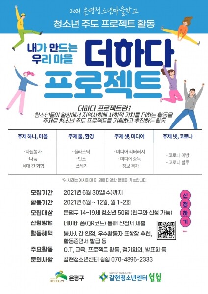 ‘은평청소년마을학교 ‘더하다 프로젝트’’에 함께할 청소년은 은평구청과 갈현청소년센터 홈페이지 또는 센터 SNS를 통해 참여할 수 있다.