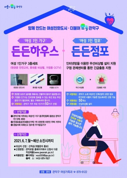 구는 3년 연속 공모에 선정되어 해마다 최대 4,000만원의 예산을 확보했으며 올해는 다세대 주택, 원룸 등 취약지역 여성 1인 가구의 '든든하우스 3종 세트' 설치 지원사업과 1인 여성 점주의 안전한 경제활동을 지원하기 위한 ‘든든점포’ 사업을 함께 추진한다.