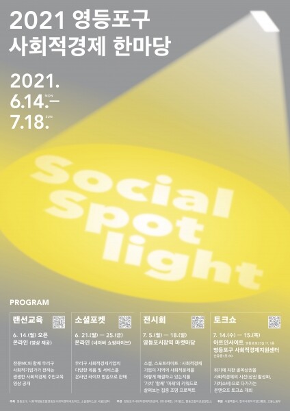 사회적경제의 개념을 보다 쉽고 흥미롭게 이해할 수 있도록 사회적경제 랜선 주민교육, 소셜포켓 ‘내 주미니 속 작은 영등포 마켓’, 전시회 ‘소셜, 스포트라이트’, 토크쇼 ‘골목 톡? 톡’ 등 다채로운 방식의 일정으로 꾸려진다.