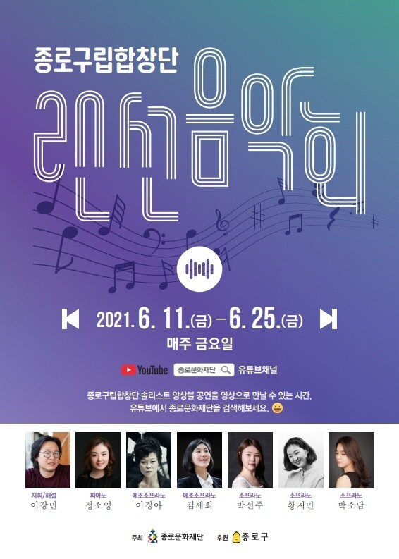 지난 6월 11일을 시작으로 이달 25일까지 매주 금요일 종로문화재단 유튜브를 통해 만나볼 수 있으며 공연자로는 전문 성악가로 구성된 종로구립합창단이 나선다.