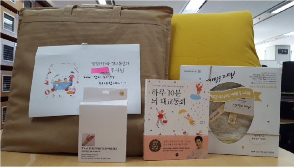 지원품목은 근무환경 개선에 도움이 될 수 있는 전자파 차단담요, 온열매트, 등받이 쿠션, 손목 보호대, 태교 동화책 등이었다.