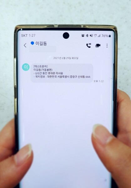 대상자 이름, 휴대폰 미사용 시간, 위치정보 등의 내용이 전송되어 받는 이가 위험을 쉽게 확인할 수 있다.