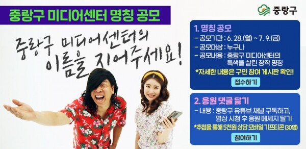 중랑구청 유튜브 채널을 구독하고 미디어센터 명칭 공모 영상을 시청한 뒤 응원 메시지를 댓글로 작성하면 된다.