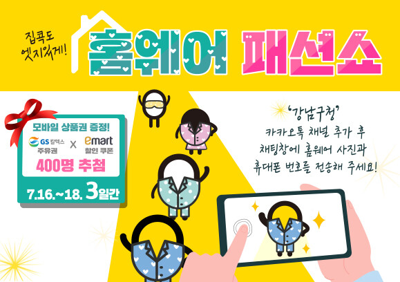 참여를 원하는 사람은 카카오톡에서 ‘강남구청’을 검색해 채널을 추가한 뒤 채팅창에 홈웨어를 착용한 사진과 연락처를 남기면 된다.