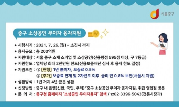 신청기간은 7월 26일부터 200억원이 소진될 때까지이며 접수는 중구 관내 신한은행, 국민은행, 우리은행 중 ‘중구 소상공인 무이자 융자지원’ 취급 영업점에서 받는다.