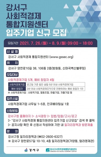 구는 ‘강서구 사회적경제 통합지원센터’에 입주할 사회적경제기업과 예비 창업자를 모집한다고 밝혔다.