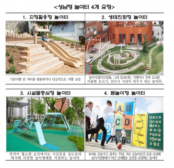 성남시 아동보육과 관계자는 “지난 3월 아동학과 교수, 박사, 건축전문가로 구성된 놀이터자문단이 4개 유형의 독창적인 성남형 놀이터를 개발했다”며 “점차 적용 범위를 확대해 나갈 것”이라고 말했다.