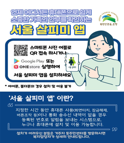 구는 연말까지 고독사 위험이 크고 안부 확인이 수시로 필요한 홀몸 어르신과 치매어르신, 중장년 1인 가구 등 주민 1,025명을 대상으로 '서울 살피미 앱'을 설치해 구민의 안전을 살피고 신속한 위기 대응체계를 구축할 방침이다.