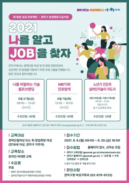 모든 강좌는 무료로 오는 8월 27일부터 9월 27일까지 진행되며 관악구에 거주하고 있는 만18세 이상의 경력단절여성 또는 취·창업희망 여성이면 누구나 신청할 수 있다.