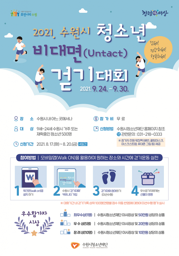 걷기 기록과 인증 사진을 제출한 우수 참가자 16명을 선정해 수원시청소년재단 이사장 명의 상장과 10~50만원 상당의 상품을 증정할 예정이다.