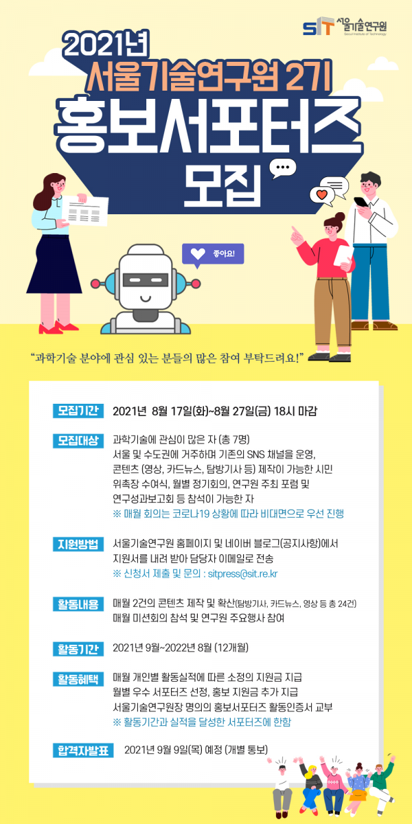 선발대상은 서울 혹은 수도권 지역에 거주하며 과학기술에 관심을 가진 시민 7명이며 기존 SNS 활동이 활발하고 카드뉴스, 탐방기사, 동영상 등의 콘텐츠 제작이 가능하다면 누구나 신청할 수 있다.