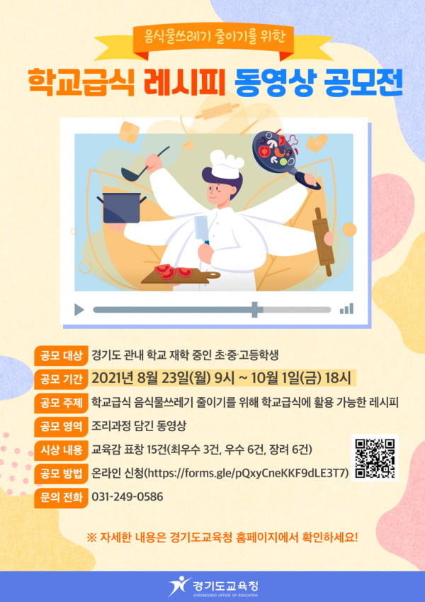 경기도 내 재학 중인 초·중·고등학생은 누구나 참여할 수 있으며 학교급식에 활용 가능한 조리과정이 담긴 동영상을 공모하면 주제의 적합성, 창의성, 완성도, 활용도 등을 심사해 수상작을 선정한다.