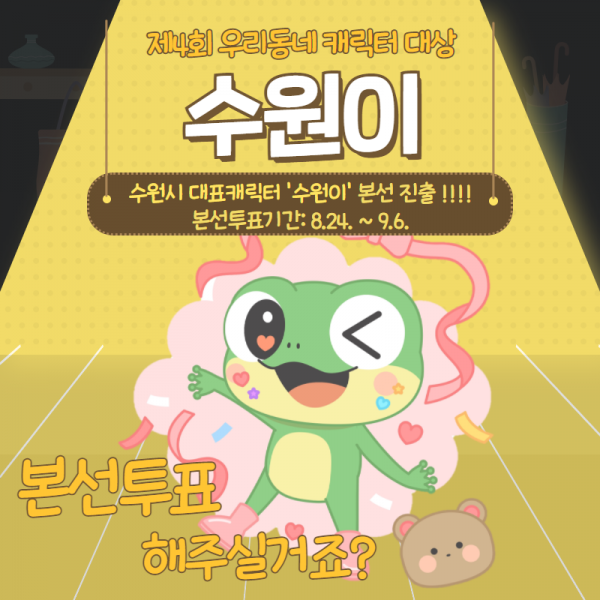 ‘수원이’는 지난 8월 9~17일 열린 예선에서 전국에서 참여한 ‘지역 부문’ 59개 캐릭터 중 대국민 투표 2위를 차지하고 10개 캐릭터가 경쟁하는 본선에 진출했다.