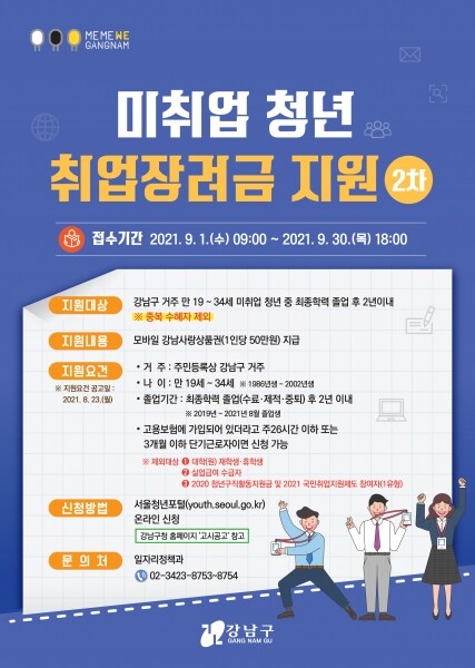 신청은 서울청년포털에서 온라인으로 가능하며 지원금은 심사를 거쳐 10월 중순 모바일 강남사랑상품권으로 지급된다.