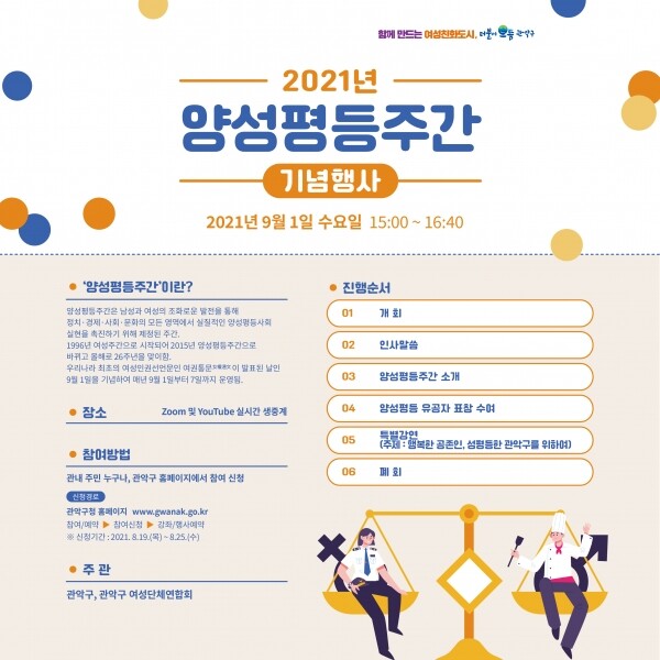 올해 양성평등주간 기념행사는 코로나19 확산방지를 위해 온라인으로 진행, 줌과 유튜브를 통해 9월 1일 오후 3시부터 4시 40분까지 실시간으로 생중계된다.