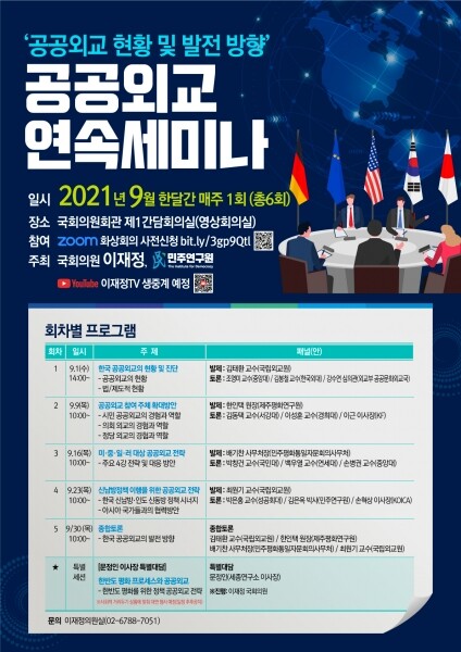 이번 공공외교 연속세미나는 비대면 화상회의방식으로 진행되며 ‘1회차: 한국 공공외교의 현황 및 진단’, ‘2회차: 공공외교 참여 주체 확대 방안’, ‘3회차: 미·중·일·러 대상 공공외교 전략’, ‘4회차: 신남방정책 이행을 위한 공공외교 전략’, ‘5회차: 종합토론’, ‘특별세션’으로 총 6회차로 진행될 예정이다.