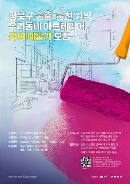 박겸수 강북구청장은 “이 사업을 통해 코로나19로 일자리가 줄어든 예술가들에게 문화·예술적 재능으로 지역경제를 활성화시킬 수 있는 계기가 될 것으로 생각한다“며 ”소상공인과 지역예술가가 서로 상생해 골목상권에 활기를 불어넣을 수 있도록 예술가들의 많은 관심과 참여를 바란다”고 말했다.